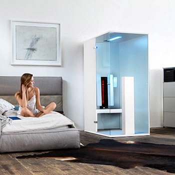 The particularly successful design of this single-seater cabin comes in Glossy White, Gloss Black, Amazon Oak, Colorado Maple or Sand Oak.